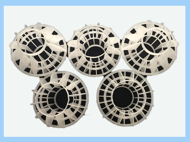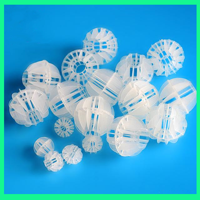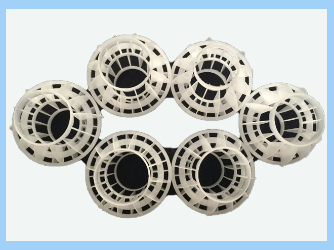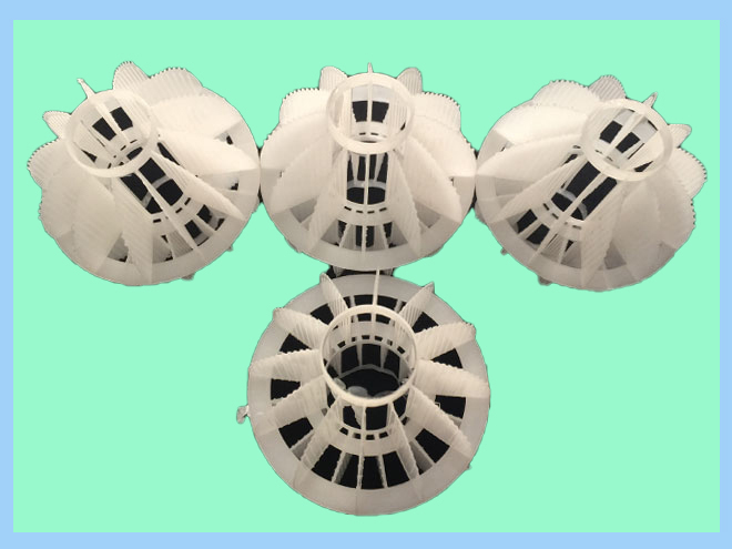 采用聚丙烯(PP)塑料制成球狀,由兩個半球合成一個球形,每個半球上根據設計需要有8-12個半扇形葉片,兩個半球的扇形葉片相互錯開。該填料特點是比表面積大,空隙率較高。但是由于葉片數偏多,彼此間有遮蔽效應,不利于液體分布和潤濕;液體大多在球體空心柱聚集,阻礙氣體暢通,因此阻力較大。
